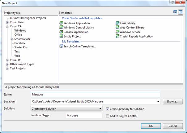 Örnek: Ben örnek olarak Visual Studio içerisinde yer almayan ama web sayfalarında çok ise yarayan Marquee(kayan yazı) kontrolünü gelistirecegim. Ilk olarak yukarıda da anlattıgım gibi WebControlLibrary olusturalım.